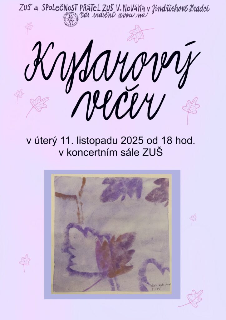 V úterý 11. listopadu 2025 v 18 hod. se v koncertním sále ZUŠ koná Kytarový večer – společný koncert žáků z kytarových tříd M. Kýčka, L. Mikulové, J. Musilové a K. Tůmové.