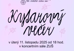 V úterý 11. listopadu 2025 v 18 hod. se v koncertním sále ZUŠ koná Kytarový večer – společný koncert žáků z kytarových tříd M. Kýčka, L.